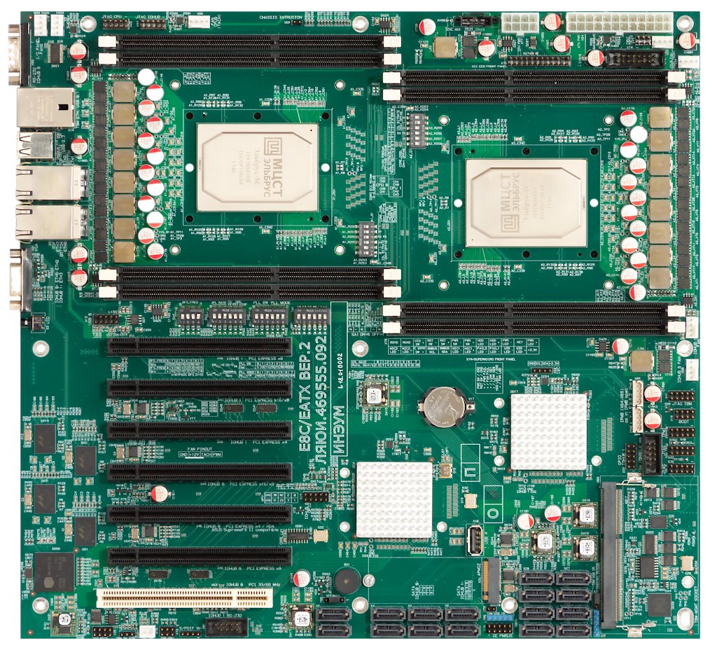 Материнская плата в форм-факторе EATX с 2 процессорами Эльбрус-8С и 2 южными мостами КПИ-2 для серверов с высокой интенсивностью ввода-вывода и большим объёмом хранимых данных.